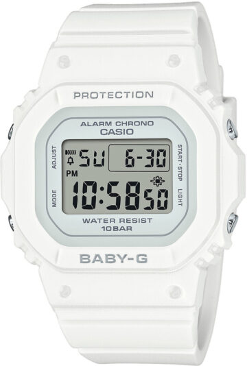 Модель BAX-100-1AER виготовлена спеціально для любительок серфінгу. Годинник оснащений додатковими функціями фаз місяця і припливів-відливів. Аналогово-цифрова індикація стане чудовим супутником під час занять і під час відпочинку. Кварцовий механізм поміщений у полімерний корпус із мінеральним склом. Полімерний ремінець надійно закріпить корпус на зап’ясті. Полімер хороший тим, що він легкий, міцний, не боїться вологи і дуже мало важить. Як і всі моделі Casio Baby-G, модель BAX-100-7AER має протиударну систему і всі основні функції цієї серії годинників. Водозахист 10 бар дасть змогу занурюватися під воду в цьому годиннику.