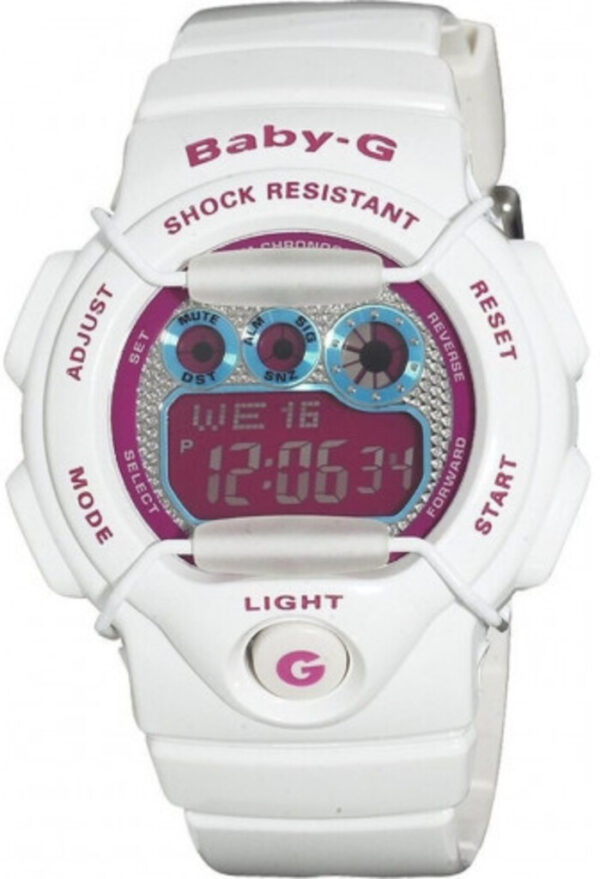 Модель унісекс годинника BG-1005M-7E колекції Casio Baby-G має корпус круглої форми виконаний з полімеру, з циферблатом білого кольору та електронними цифрами захищеним мінеральним склом. Пластиковий ремінець білого кольору, електронний механізм. Додаткові функції: Удароміцні, Повністю автоматичний календар, Світовий час, 12/24 годинний формат часу, Електролюмінесцентне підсвічування, Секундомір, Таймер зворотного відліку, Будильник, Функція повтору сигналу, Увімкнення/вимкнення звуку. Годинник захищений від бризок, зокрема від дощу, але занурювати у воду його не можна.