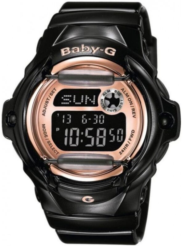 Модель жіночого годинника BG-169G-1E колекції Casio Baby-G має корпус круглої форми виконаний з полімеру, з циферблатом тілесного кольору та електронними цифрами захищеним мінеральним склом. Пластиковий ремінець чорного кольору, електронний механізм. Додаткові функції: Удароміцні, Повністю автоматичний календар, Лічильник днів, Світовий час, 12/24 годинний формат часу, Електролюмінесцентне підсвічування, Секундомір, Таймер зворотного відліку, Телефонна книжка, Будильник, Функція повтору сигналу, Увімкнення/вимкнення звуку. Ця модель годинника підходить для дайвінгу.