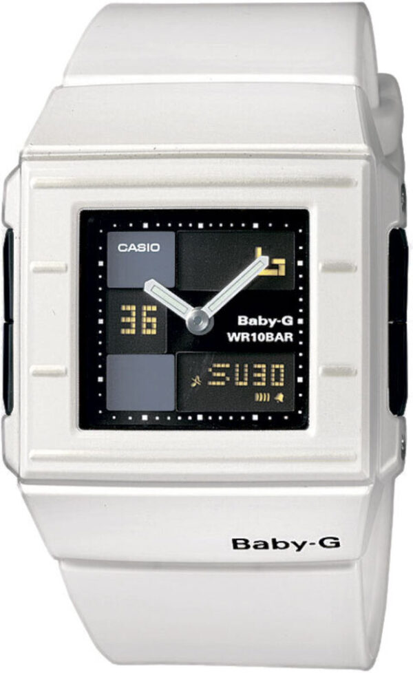 Модель жіночого годинника BGA-200-7E2 колекції Casio Baby-G має корпус прямокутної форми виконаний з полімеру, з циферблатом чорного кольору та електронними цифрами та індексами захищеним мінеральним склом. Пластиковий ремінець білого кольору, кварцовий + електронні механізми. Додаткові функції: Удароміцні, Повністю автоматичний календар, Світовий час, 12/24 годинний формат часу, Світлодіодне підсвічування, Секундомір, Таймер зворотного відліку, Будильник, Увімкнення/вимкнення звуку. У цьому годиннику можна плавати і пірнати на невелику глибину до 3-5 метрів.