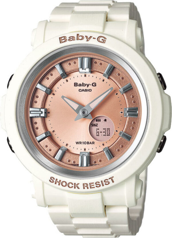 Модель жіночого годинника BGA-300-7A2 колекції Casio Baby-G має корпус круглої форми виконаний з полімеру, з циферблатом рожевого кольору та електронними цифрами та індексами захищеним мінеральним склом. Пластиковий ремінець білого кольору. Кварцовий + електронний механізм забезпечить точність ходу. Додаткові функції: Удароміцні, Повністю автоматичний календар, Світовий час, 12/24 годинний формат часу, Світлодіодне підсвічування, Секундомір, Таймер зворотного відліку, Будильник, Функція повтору сигналу. У цьому годиннику можна плавати і пірнати на невелику глибину до 3-5 метрів.