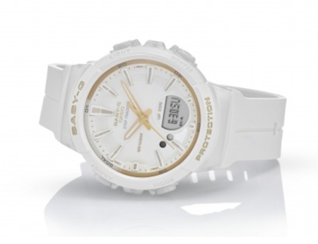 Вони мають полімерний білий корпус, браслет і циферблат із золотистими годинниковими мітками. Темний дисплей і ударостійка конструкція захищають механізм від ударів і вібрації. Мінеральне скло надійно захищає механізм від виникнення подряпин. Додаткові функції: секундомір, таймер зворотного відліку, 5 щоденних будильників, світовий час, світлодіодне підсвічування, крокомір із графічним відображенням пройдених кроків та інші функції. Батарейка розрахована на 2 роки експлуатації. Цей спортивний годинник ідеально підходить для активних і стильних дівчат.