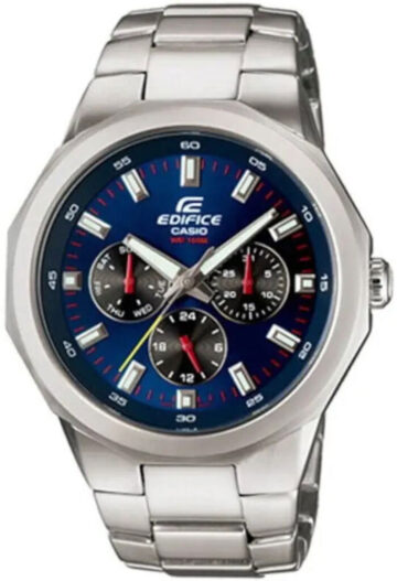 Модель чоловічого годинника EFR-506D-7A колекції Casio Edifice має корпус круглої форми виконаний з нержавіючої сталі, з циферблатом білого кольору та індексами захищеним мінеральним склом. Сталевий браслет, хронограф кварцовий. Календар (кількість, день тижня). У цьому годиннику можна плавати і пірнати на невелику глибину до 3-5 метрів.