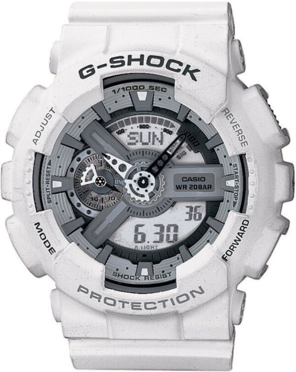 Для любителів активного способу життя і спортсменів уже давно не стоїть питання вибору наручних хронографів. Усе, про що можна тільки мріяти, вже давно втілено в спортивних моделях компанії Casio та їхніх спортивних лінійках. Casio GA-110C-7AER – одна з найбільш затребуваних моделей з колекції G-Shock. На перший погляд у них немає нічого примітного, крім масивного корпусу, виконаного з міцного пластику білого кольору і полімерного ремінця в тон. Але все найцікавіше криється всередині цієї кварцової моделі. Перша і основна перевага – протиударні властивості. Навіть падіння з велосипеда, пройде для цього годинника непоміченим. Магнітостійкість так само має велике значення і забезпечує безперебійну роботу механізму в будь-якій точці світу. Годинник Casio GA-110C-7AER оснащений таймером, кількома будильниками, підсвічуванням і світовим часом. Особливості конструкції дають змогу занурюватися в них на глибину до 200 м. Циферблат відображає дані в аналоговому форматі та цифровому. Ця модель стане не тільки Вашим надійним, але й стильним супутником у найнеймовірніших подорожах.