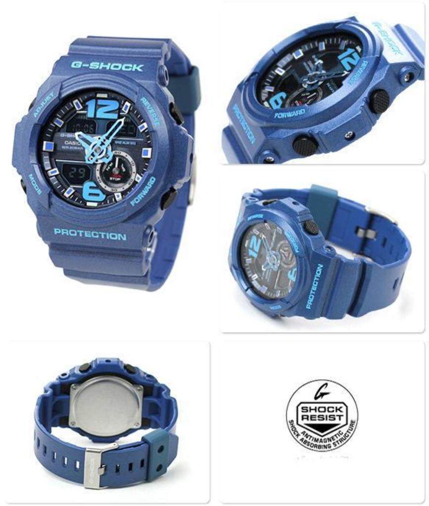 Новий аналого-цифровий циферблат додасть свіжості Вашому образу, а міцність годинника G-Shock не підведе в будь-якій ситуації. Світлодіодне автоматичне супер-підсвічування. Під час руху руки дисплей висвітлюється яскравим світлом. Протиударний корпус захищає механізм від ударів та вібрації. Захищені від магнітних полів. Секундомір з точністю показань 1/100с та часом вимірювання 1000ч. Спліт-хронограф. Таймер зворотного відліку від 1хв до 24ч. Світовий час. 12-ти та 24-х годинний формат часу. Функція увімкнення/вимкнення звуку.