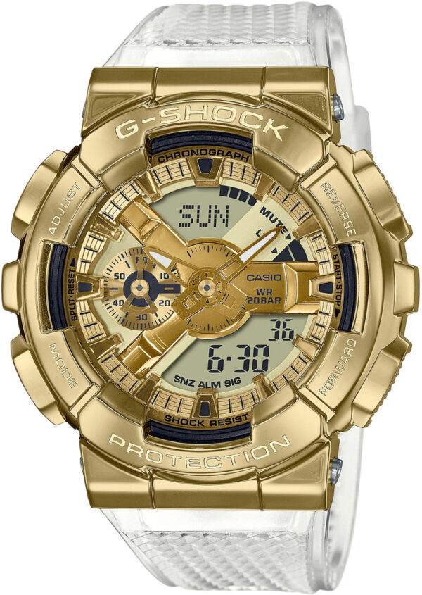 Дорогі чоловіки, неодмінно зверніть увагу на цю модель комбінованих CASIO GM-110SG-9AER! Вас зачарує колірна гамма, в якій вона виконана. Потужний корпус являє собою комбінацію з нержавіючої сталі та полімерного пластику в дуже затребуваному нині іонному кольорі позолоти. Ремінець також полімерний, білого кольору прозорої фактури. Застібка браслета золота, в тон корпусу. Тандем золота з ніжно-білим справляє воістину незабутнє враження. На золотисто-сірому тілі комбінованого циферблата розташовані накладні позолочені індекси, люмінесцентні стрілки та електронна індикація арабських цифр. Скло, що захищає циферблат, мінеральне, виготовлене методом розжарювання. Водонепроникність 200 м. Функції, якими володіє ця модель: повністю автоматичне світлодіодне підсвічування, ударостійкість, функція світового часу, секундомір, таймер, 5 щоденних будильників, автоматичний календар, 12/24-годинне відображення часу. Механізм кварцовий.