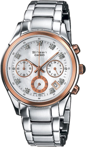 Модель жіночого годинника SHN-3008D-7A колекції Casio Sheen має корпус круглої форми з інкрустацією, виконаний з нержавіючої сталі, з циферблатом білого кольору та арабськими цифрами та індексами захищеним мінеральним склом. Сталевий браслет, кварцовий механізм. А додаткові функції: Календар (число, день тижня), 12/24 годинний формат часу надають зручності. У цьому годиннику можна плавати, але не пірнати глибше 3 метрів.