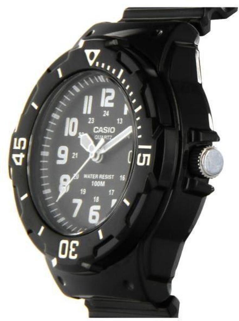 Аксесуар входить до колекції недорогих годинників з аналоговою індикацією Standard Analogue. Ремінець полімерний, корпус виготовлений із високоміцного пластику. Плексигласове скло забезпечує водостійкість моделі (100 м). З додаткових функцій можна виділити індикатор дати та безель з одностороннім обертанням, що дозволяє максимально точно вимірювати часові проміжки. Важить кварцовий годинник CASIO LRW-200H-1BVEF 25 г, тому він практично не відчувається на руці.