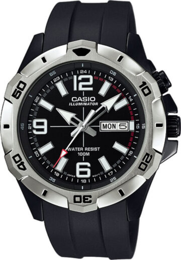 Модель чоловічого годинника MTD-1070D-1A2 колекції Casio Duro200 має корпус круглої форми виконаний з нержавіючої сталі з PVD, з циферблатом чорного кольору та арабськими цифрами та індексами захищеним мінеральним склом. Браслет сталь+полімер, кварцовий механізм. А додаткова функція дати надає зручності. У цьому годиннику можна плавати і пірнати на невелику глибину до 3-5 метрів.