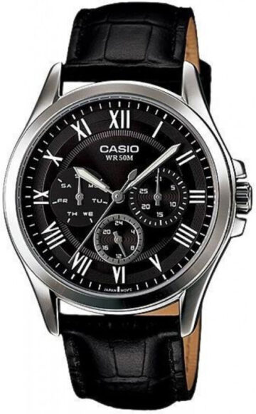 Всесвітньо відомий бренд Casio вже давно завоював прихильність поціновувачів якісних годинників і пройшов перевірку часом. Casio впевнено тримає позиції у своєму ціновому сегменті та постійно вдосконалює свою майстерність. Серія Casio Standard Analogue – втілення японської якості та практичності. Модель Casio MTP-1302PD-1a2vef ідеально підходить для кожного дня, мінімалістичний стиль виконання циферблата робить цю модель універсальною. Але нестандартне поєднання чорного циферблата із золотистою індикацією і сталевим браслетом безумовно виділяє цю модель з усіх інших цієї серії. Корпус з латуні, а браслет виконані з нержавіючої сталі, найбільш довговічного і практичного матеріалу. Надійний водозахист 50 м і стійке до механічних пошкоджень мінеральне скло забезпечує захист механізму годинника.